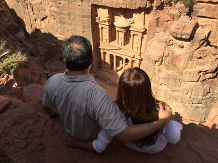 A further 20+ kilometer hike from The Treasury, up 800 winding steps, under searing desert sun, took us past the monastery and adjoining structures. Made of sandstone. Constructed by Nabateans. Built in the first century. The thrill of the trek was not the destination, but the challenging terrain. Donkeys carried water and logistics up the dusty trails and galloped back down again at break-neck speeds with empty vessels. The dangling carrot that encouraged us to keep walking was the view at the cliff edge...