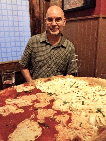 My bro in-law did his homework and knew what to order. One large, i.e., 18-inch pie, half original flavour and the other half 'white pizza'. Cut into eight slices, that's one slice of each flavour for every hungry participant, if you're counting. The 'Lombardi's original' consisted of mozzarella and fresh tomato sauce, with a hint of romano and basil. The other half of the pan was the highlight. White pizza contains mozzarella, ricotta, some other cheeses, without any hint of tomato sauce. Hmmm… don't just stare Kent, dig in!!
