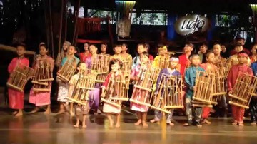 A medium to invite the rice goddess Dewi Sri, designated World Heritage status by UNESCO, and featured in a 2013 episode of reality TV's The Amazing Race, the Angklung is a musical instrument, or a series of instruments made primarily of bamboo. Originating from Indonesia and played by the Sundanese for centuries, an angklung is held with two hands, one holding firmly a top corner of the contraption, and the other hand on the opposite bottom end, shaking the instrument to create a hollow rattling sound. One piece of angklung creates one particular pitch; a series of angklungs create full scales and octaves.